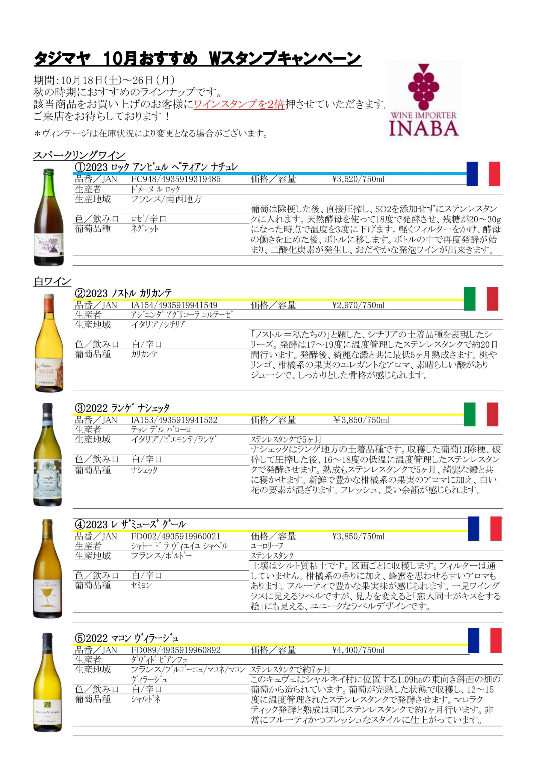 10/22(土)~30(日) 10月のお薦めワインをお買い上げのお客様にはワインスタンプを2倍押させていただきます!