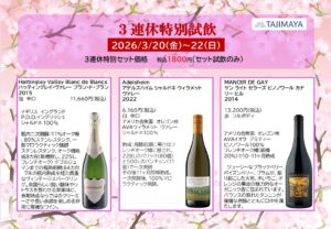 建国記念の日3連休特別試飲 2024 2/08 お知らせ 試飲 2024年2月8日 ~プレミアムワイン試飲に際してのお願い~※大変恐縮ですが、試飲は15分程度でお願いいたします。※ご質問やご意見は、試飲終了後お伺いいたします。※試飲は同時に2組様までとさせていただきます。混みあった場合は店内でお待ちください。順番にご案内させていただきます。 お知らせ 試飲 よかったらシェアしてね! URLをコピーしました! URLをコピーしました! 2月のご案内 2月スタンプ2倍キャンペーン! この記事を書いた人 新部 博康 タジマヤ四代目店主 社団法人日本ソムリエ協会認定のソムリエ資格 フランス食品振興会認定のコンセイエ資格 ドイツワインケナー資格 関連記事 三連休特別試飲 2026年3月20日 三連休特別試飲 2026年2月22日 2月のご案内 2026年2月5日 三連休特別試飲 2026年1月9日 歳末プレミアムワイン試飲 2025年12月27日 12月のご案内 2025年12月19日 三連休特別試飲 2025年11月21日 おうちでボジョレヌーボー 2025 2025年11月12日