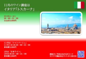 ワイン講座開催! 2024 6/20 ワイン講座 2024年6月20日2024年7月20日 ワイン講座 よかったらシェアしてね! URLをコピーしました! URLをコピーしました! 6月スタンプ2倍キャンペーン 7月のご案内 この記事を書いた人 新部 博康 タジマヤ四代目店主 社団法人日本ソムリエ協会認定のソムリエ資格 フランス食品振興会認定のコンセイエ資格 ドイツワインケナー資格 関連記事 ワイン講座 ニューワールド「オーストラリア赤」 2025年10月3日 タジマヤワイン講座月間 2025年5月29日 ワイン講座「シャンパーニュ」 2025年5月29日 ワイン講座 アルザス 2025年3月18日 ワイン講座 ロワール 満席となりました 2025年3月18日 ワイン講座 フランス・ボルドー 2025年1月25日 ワイン講座 2025年1月22日 秋のワイン講座開催「イタリア」 2024年10月16日