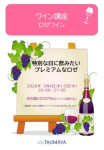 ワイン講座 2025 1/22 ワイン講座 2025年1月22日 各回定員6名です。お電話にてご予約を承ります。 ワイン講座 よかったらシェアしてね! URLをコピーしました! URLをコピーしました! 1月スタンプ2倍キャンペーン ワイン講座 フランス・ボルドー この記事を書いた人 新部 博康 タジマヤ四代目店主 社団法人日本ソムリエ協会認定のソムリエ資格 フランス食品振興会認定のコンセイエ資格 ドイツワインケナー資格 関連記事 ワイン講座「ロゼ ワイン」 2026年3月1日 ワイン講座「ミラノ・コルティナ近郊のワイン」 2026年2月6日 ワイン講座申込み受付中 2026年1月25日 ワイン講座「日本ワイン」 2026年1月21日 ワイン講座 フランス「シャンパーニュ」 2025年11月10日 ワイン講座イタリア「トスカーナ 赤」 2025年11月3日 ワイン講座 ニューワールド「オーストラリア赤」 2025年10月3日 タジマヤワイン講座月間 2025年5月29日