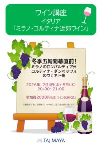ワイン講座 フランス・ボルドー 2025 1/25 ワイン講座 2025年1月25日 ~ワイン試飲に際してのお願い~※自転車の飲酒運転取り締まりが厳しくなりました。当店では自転車でご来店のお客様のご試飲を固くお断りしています。ご協力をお願い致します。 ワイン講座 よかったらシェアしてね! URLをコピーしました! URLをコピーしました! ワイン講座 2月のご案内 この記事を書いた人 新部 博康 タジマヤ四代目店主 社団法人日本ソムリエ協会認定のソムリエ資格 フランス食品振興会認定のコンセイエ資格 ドイツワインケナー資格 関連記事 ワイン講座「ミラノ・コルティナ近郊のワイン」 2026年2月6日 ワイン講座申込み受付中 2026年1月25日 ワイン講座「日本ワイン」 2026年1月21日 ワイン講座 フランス「シャンパーニュ」 2025年11月10日 ワイン講座イタリア「トスカーナ 赤」 2025年11月3日 ワイン講座 ニューワールド「オーストラリア赤」 2025年10月3日 タジマヤワイン講座月間 2025年5月29日 ワイン講座「シャンパーニュ」 2025年5月29日