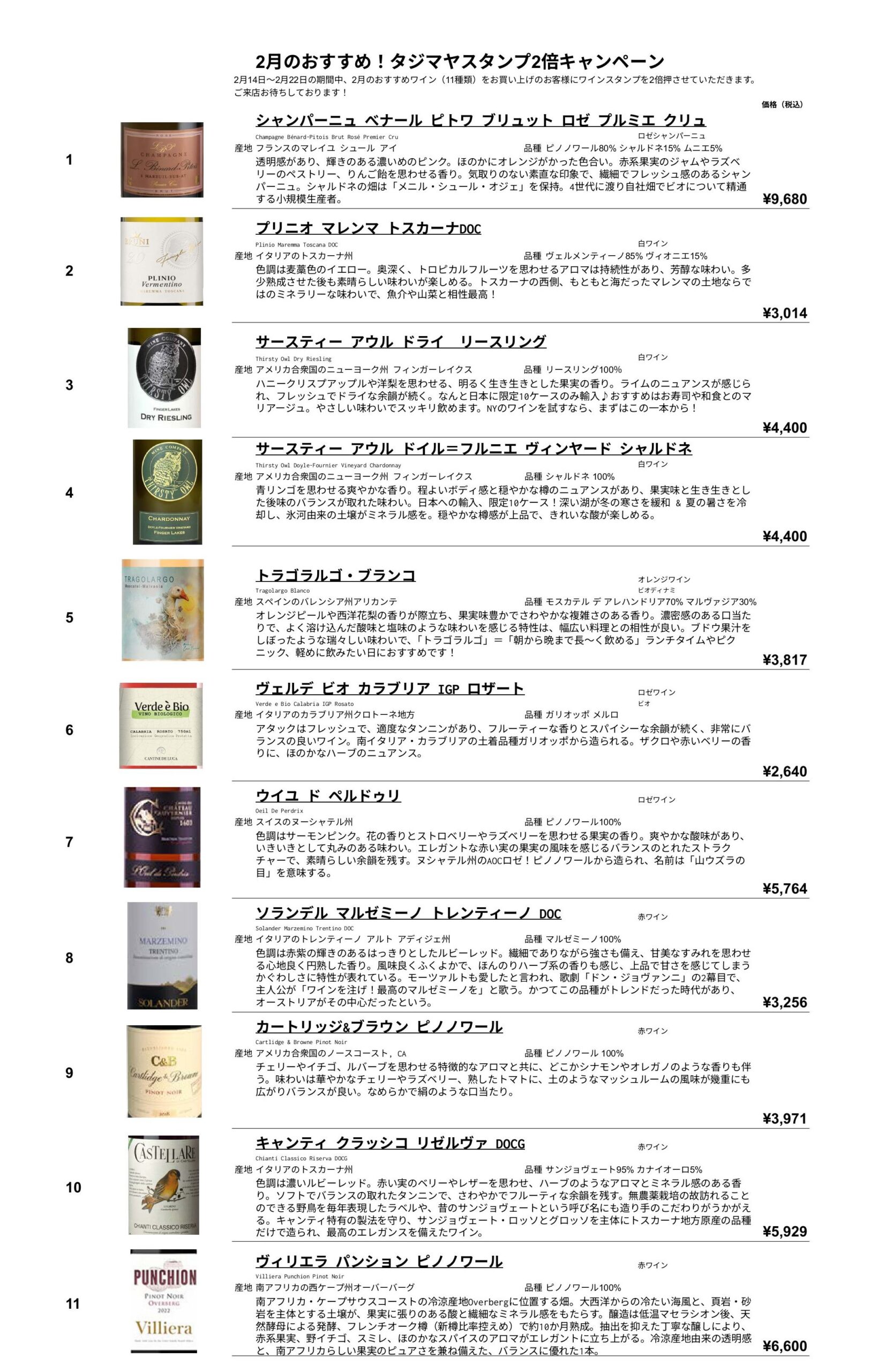 3月のご案内 2025 3/01 お知らせ 2025年3月1日 お知らせ よかったらシェアしてね! URLをコピーしました! URLをコピーしました! 三連休特別試飲 3月スタンプ2倍キャンペーン この記事を書いた人 新部 博康 タジマヤ四代目店主 社団法人日本ソムリエ協会認定のソムリエ資格 フランス食品振興会認定のコンセイエ資格 ドイツワインケナー資格 関連記事 2月のご案内 2026年2月5日 12月のご案内 2025年12月19日 三連休特別試飲 2025年11月21日 おうちでボジョレヌーボー 2025 2025年11月12日 11月のご案内 2025年11月1日 10月のご案内 2025年10月1日 9月のご案内 2025年9月3日 8月のご案内 2025年8月1日