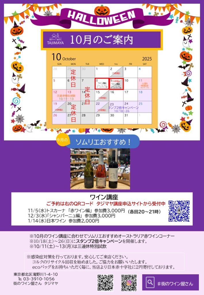 10月のご案内 2025 10/01 お知らせ 2025年10月1日2025年10月9日 お知らせ よかったらシェアしてね! URLをコピーしました! URLをコピーしました! おうちでボジョレヌーボー 2025 ワイン講座 ニューワールド「オーストラリア赤」 この記事を書いた人 新部 博康 タジマヤ四代目店主 社団法人日本ソムリエ協会認定のソムリエ資格 フランス食品振興会認定のコンセイエ資格 ドイツワインケナー資格 関連記事 おうちでボジョレヌーボー 2025 2025年9月28日 9月のご案内 2025年9月3日 8月のご案内 2025年8月1日 7月のご案内 2025年7月1日 北海道余市町にタジマヤの葡萄の苗木を植樹‼ 2025年6月20日 6月のご案内 2025年5月30日 5月のご案内 2025年5月1日 4月のご案内 2025年4月1日
