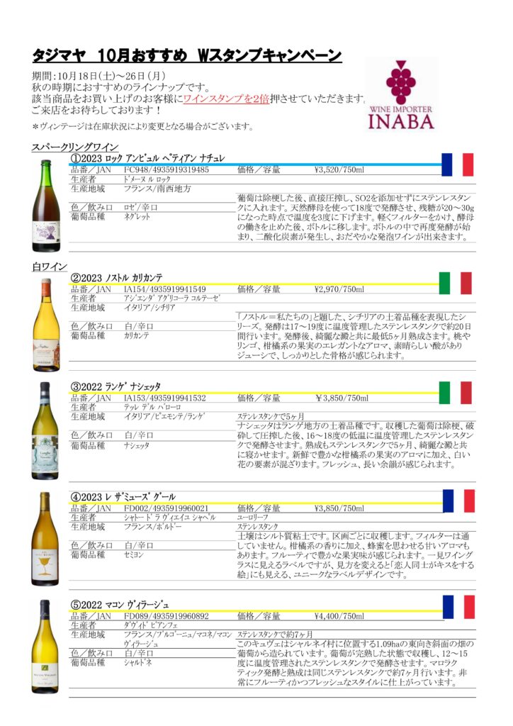 10月スタンプ2倍キャンペーン 2025 10/16 キャンペーン情報 2025年10月16日 2025年 10/18(土)~26(日) 10月のおすすめワインをお買い上げのお客様にはワインスタンプを2倍押させていただきます!おまとめ買いのチャンスです!ご来店をお待ちしております! キャンペーン情報 よかったらシェアしてね! URLをコピーしました! URLをコピーしました! 3連休特別試飲「ボルドー右岸とローヌロゼ」 この記事を書いた人 新部 博康 タジマヤ四代目店主 社団法人日本ソムリエ協会認定のソムリエ資格 フランス食品振興会認定のコンセイエ資格 ドイツワインケナー資格 関連記事 9月スタンプ2倍キャンペーン 2025年9月18日 8月スタンプ2倍キャンペーン 2025年8月12日 7月スタンプ2倍キャンペーン 2025年7月16日 6月スタンプ2倍キャンペーン 2025年6月20日 5月スタンプ2倍キャンペーン 2025年5月12日 4月スタンプ2倍キャンペーン 4/19~27 2025年4月11日 3月スタンプ2倍キャンペーン 2025年3月16日 2月スタンプ2倍キャンペーン 2025年2月12日