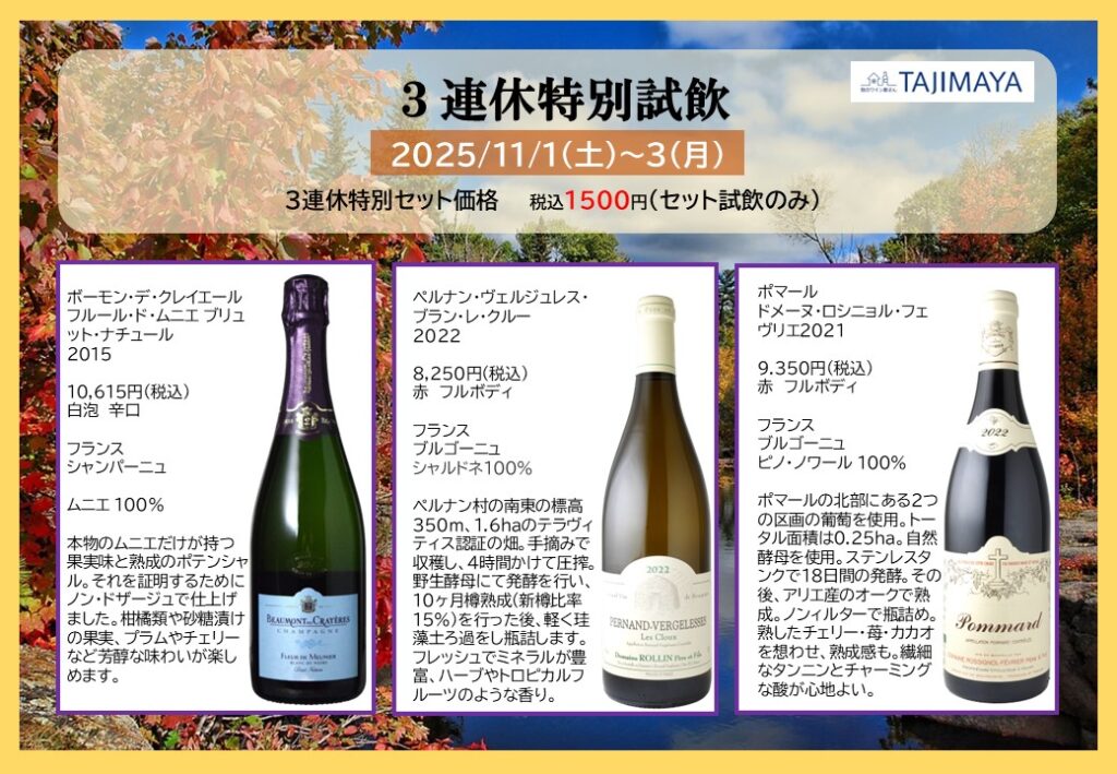 3連休特別試飲「シャンパーニュとブルゴーニュ」 2025 10/30 試飲 2025年10月30日 ~ワイン試飲に際してのお願い~※自転車の飲酒運転取り締まりが厳しくなりました。当店では自転車でご来店のお客様のご試飲を固くお断りしています。ご協力をお願い致します。 ※大変恐縮ですが、試飲は15分程度でお願いいたします。※ご質問やご意見は、試飲終了後お伺いいたします。※試飲は同時に2組様までとさせていただきます。混みあった場合は店内でお待ちください。順番にご案内させていただきます。 試飲 よかったらシェアしてね! URLをコピーしました! URLをコピーしました! 10月スタンプ2倍キャンペーン この記事を書いた人 新部 博康 タジマヤ四代目店主 社団法人日本ソムリエ協会認定のソムリエ資格 フランス食品振興会認定のコンセイエ資格 ドイツワインケナー資格 関連記事 3連休特別試飲「ボルドー右岸とローヌロゼ」 2025年10月10日 連休特別試飲「ピノノワール」 2025年5月2日 三連休特別試飲 2025年2月21日 三連休特別試飲 2025年1月12日 ルイ ロデレール クリスタル 2014 2024年12月23日 オーパス ワン 2019 2024年12月11日 年末年始プレミアム試飲① 2024年12月7日 秋の三連休特別試飲④ 2024年11月1日