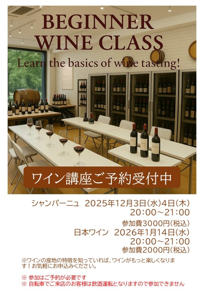 ワイン講座 フランス「シャンパーニュ」 2025 11/10 ワイン講座 2025年11月10日 講座のご予約は下のQRコードのタジマヤ講座申込サイトから受付中 https://forms.gle/Hu1LGhEXaxk6vNHUA ワイン講座 よかったらシェアしてね! URLをコピーしました! URLをコピーしました! ワイン講座イタリア「トスカーナ 赤」 この記事を書いた人 新部 博康 タジマヤ四代目店主 社団法人日本ソムリエ協会認定のソムリエ資格 フランス食品振興会認定のコンセイエ資格 ドイツワインケナー資格 関連記事 ワイン講座イタリア「トスカーナ 赤」 2025年11月3日 ワイン講座 ニューワールド「オーストラリア赤」 2025年10月3日 タジマヤワイン講座月間 2025年5月29日 ワイン講座「シャンパーニュ」 2025年5月29日 ワイン講座 アルザス 2025年3月18日 ワイン講座 ロワール 満席となりました 2025年3月18日 ワイン講座 フランス・ボルドー 2025年1月25日 ワイン講座 2025年1月22日