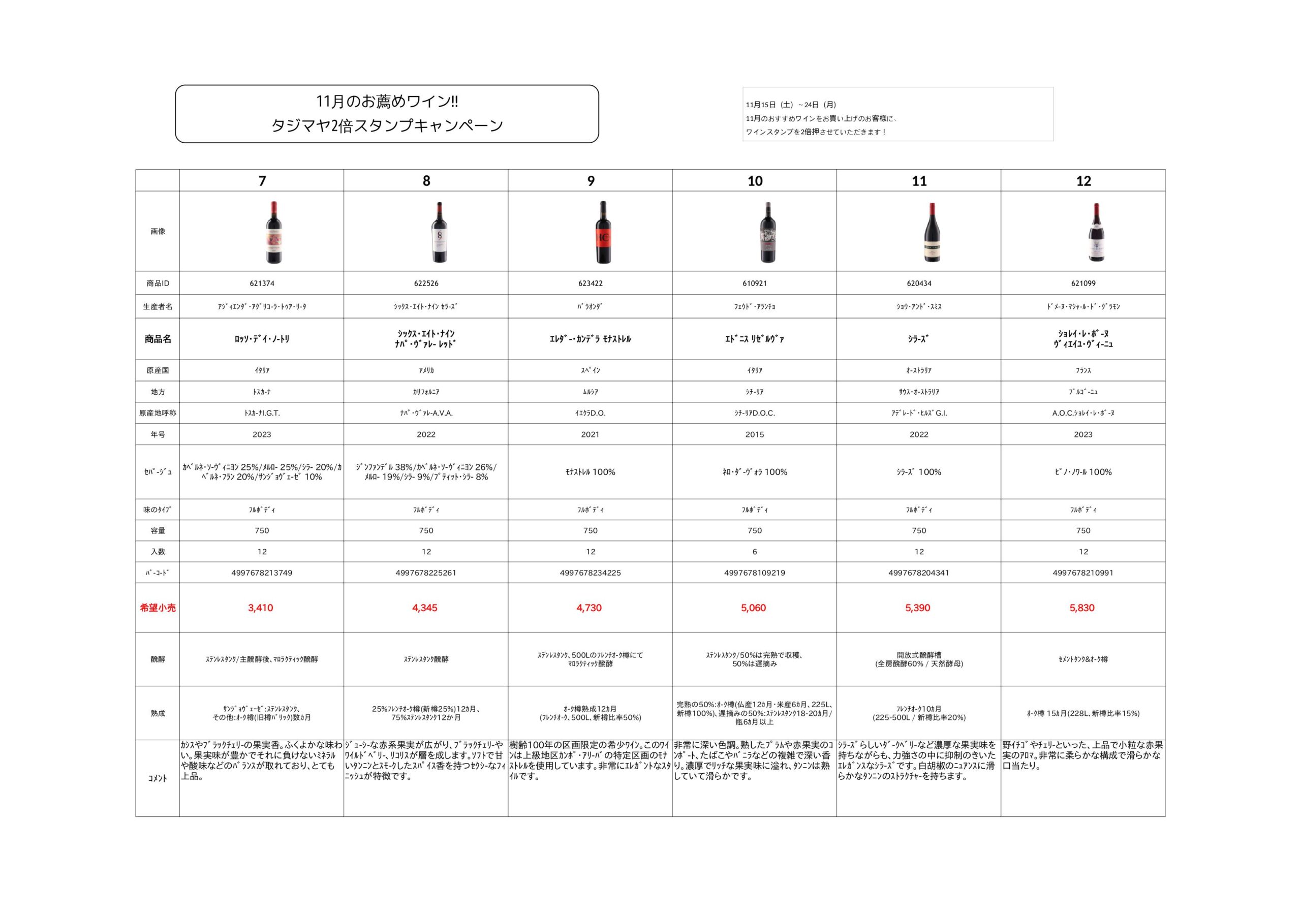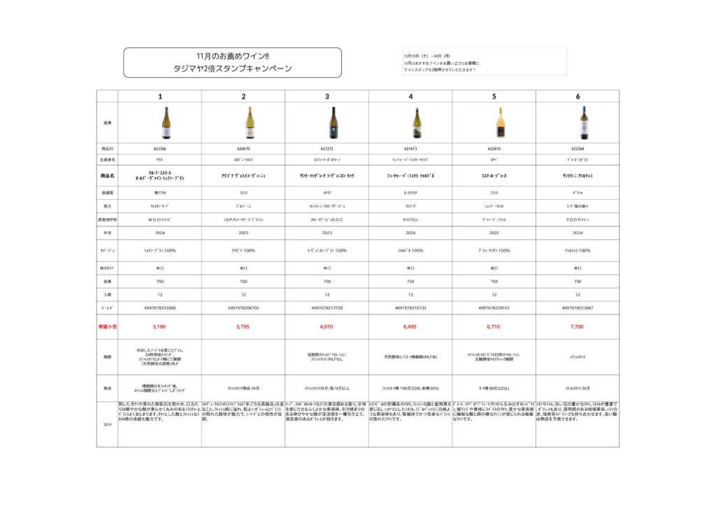 11月スタンプ2倍キャンペーン 2025 11/14 キャンペーン情報 2025年11月14日 2025年 11/15(土)~24(月) 11月のおすすめワインをお買い上げのお客様にはワインスタンプを2倍押させていただきます!おまとめ買いのチャンスです!ご来店をお待ちしております! キャンペーン情報 よかったらシェアしてね! URLをコピーしました! URLをコピーしました! おうちでボジョレヌーボー 2025 この記事を書いた人 新部 博康 タジマヤ四代目店主 社団法人日本ソムリエ協会認定のソムリエ資格 フランス食品振興会認定のコンセイエ資格 ドイツワインケナー資格 関連記事 10月スタンプ2倍キャンペーン 2025年10月16日 9月スタンプ2倍キャンペーン 2025年9月18日 8月スタンプ2倍キャンペーン 2025年8月12日 7月スタンプ2倍キャンペーン 2025年7月16日 6月スタンプ2倍キャンペーン 2025年6月20日 5月スタンプ2倍キャンペーン 2025年5月12日 4月スタンプ2倍キャンペーン 4/19~27 2025年4月11日 3月スタンプ2倍キャンペーン 2025年3月16日