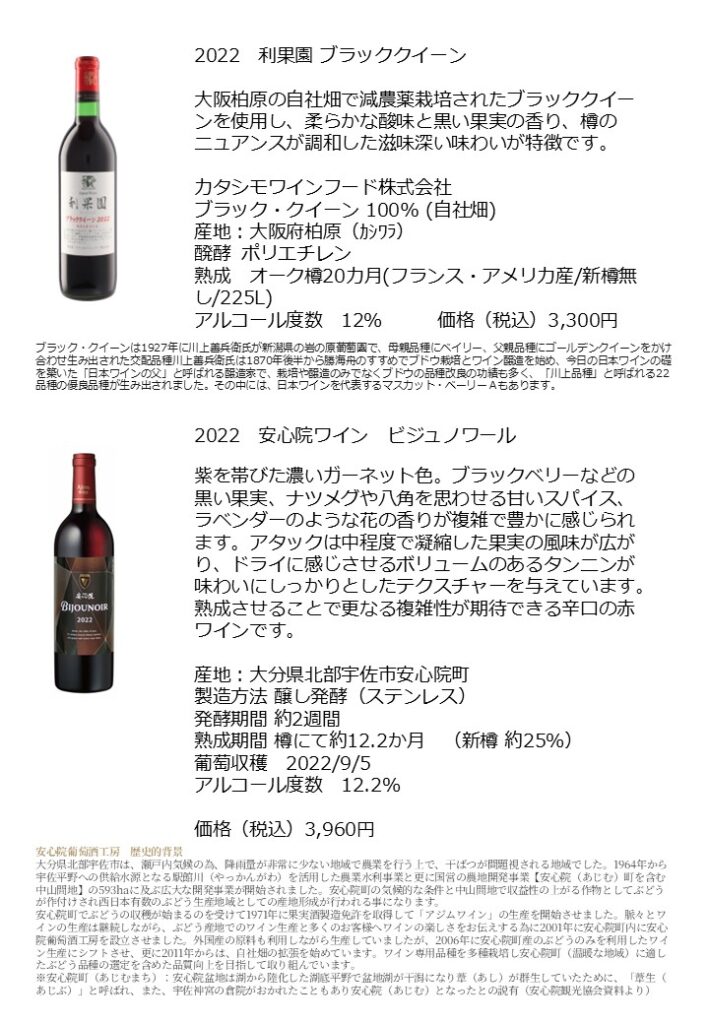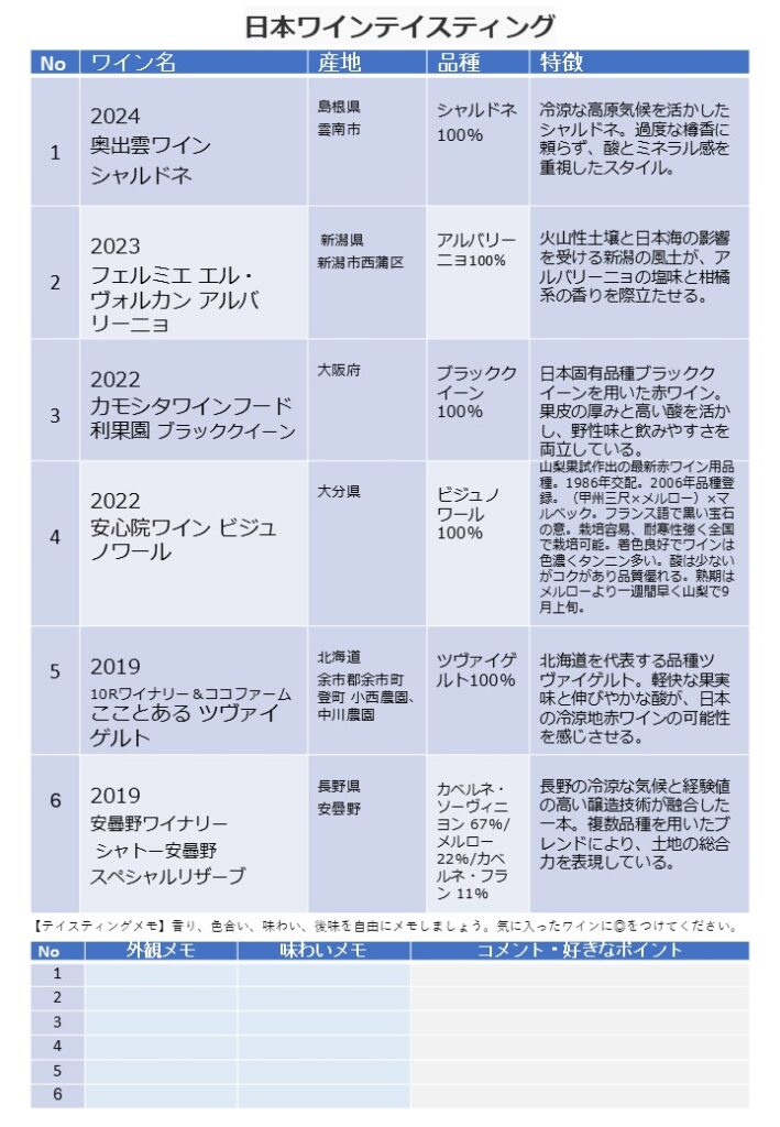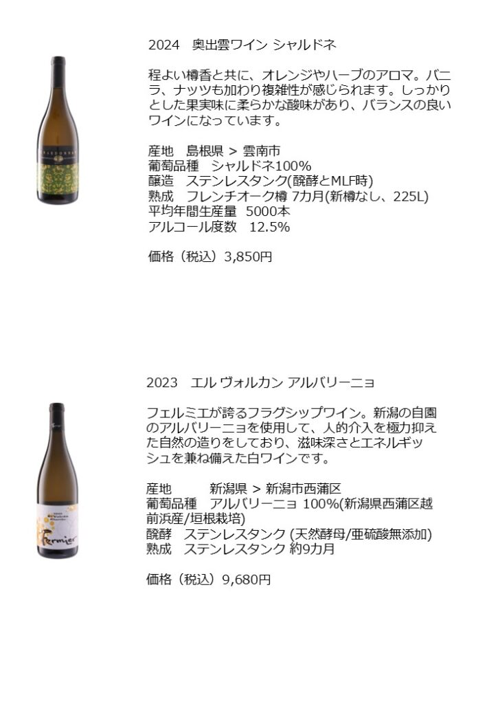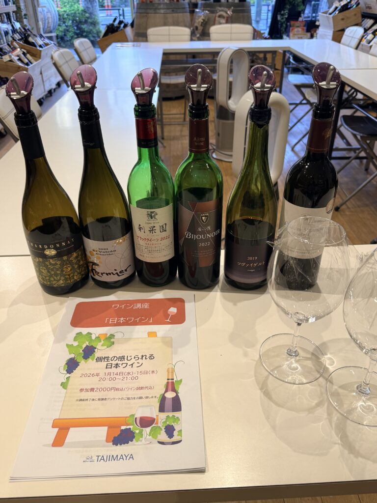 ワイン講座「日本ワイン」 2026 1/21 ワイン講座 2026年1月21日 ワイン講座で高評価のワイン販売中です。 ワイン講座 よかったらシェアしてね! URLをコピーしました! URLをコピーしました! 1月スタンプ2倍キャンペーン この記事を書いた人 新部 博康 タジマヤ四代目店主 社団法人日本ソムリエ協会認定のソムリエ資格 フランス食品振興会認定のコンセイエ資格 ドイツワインケナー資格 関連記事 ワイン講座 フランス「シャンパーニュ」 2025年11月10日 ワイン講座イタリア「トスカーナ 赤」 2025年11月3日 ワイン講座 ニューワールド「オーストラリア赤」 2025年10月3日 タジマヤワイン講座月間 2025年5月29日 ワイン講座「シャンパーニュ」 2025年5月29日 ワイン講座 アルザス 2025年3月18日 ワイン講座 ロワール 満席となりました 2025年3月18日 ワイン講座 フランス・ボルドー 2025年1月25日
