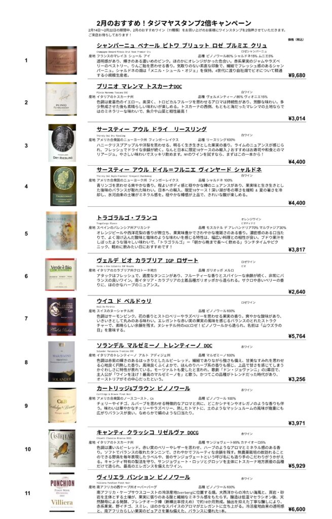 2月スタンプ2倍キャンペーン 2026 2/12 キャンペーン情報 2026年2月12日 2026年 2/14(土)~22(日) 2月のおすすめワインをお買い上げのお客様にはワインスタンプを2倍押させていただきます!おまとめ買いのチャンスです!ご来店をお待ちしております! キャンペーン情報 よかったらシェアしてね! URLをコピーしました! URLをコピーしました! ワイン講座「ミラノ・コルティナ近郊のワイン」 この記事を書いた人 新部 博康 タジマヤ四代目店主 社団法人日本ソムリエ協会認定のソムリエ資格 フランス食品振興会認定のコンセイエ資格 ドイツワインケナー資格 関連記事 1月スタンプ2倍キャンペーン 2026年1月16日 11月スタンプ2倍キャンペーン 2025年11月14日 10月スタンプ2倍キャンペーン 2025年10月16日 9月スタンプ2倍キャンペーン 2025年9月18日 8月スタンプ2倍キャンペーン 2025年8月12日 7月スタンプ2倍キャンペーン 2025年7月16日 6月スタンプ2倍キャンペーン 2025年6月20日 5月スタンプ2倍キャンペーン 2025年5月12日